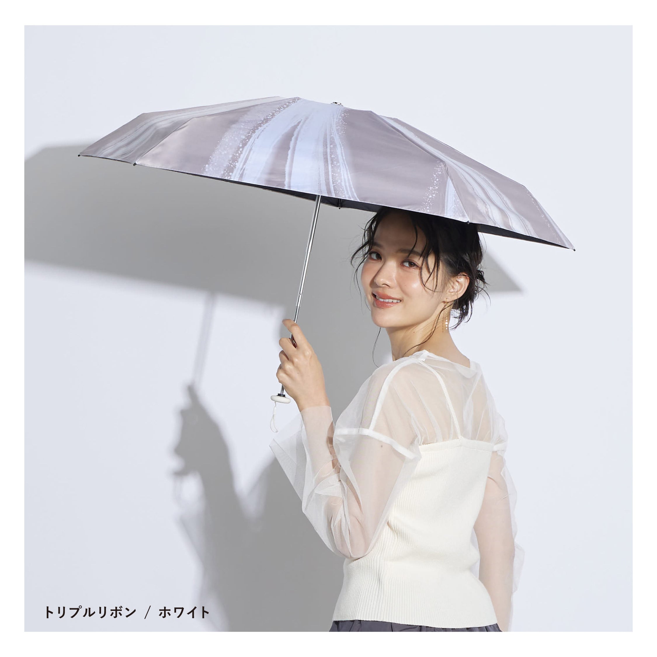 巾着にゴールドリングがついたアクセサリーみたいなパラソル。 腕にかけたり、バッグにつけたり、 ファッショナブルに持ち歩けます。 遮光・UVカット率ともに100%生地使用。 2color:Mocha , BlueGray Material:polyester 100% Size:50cm Type:puchimini