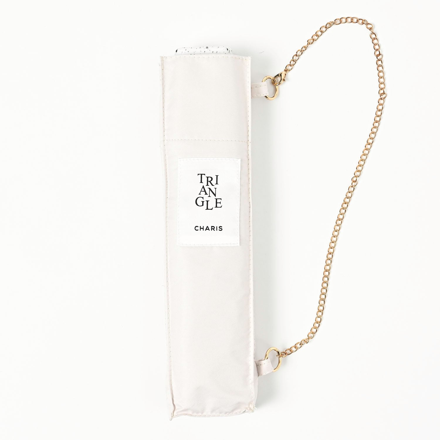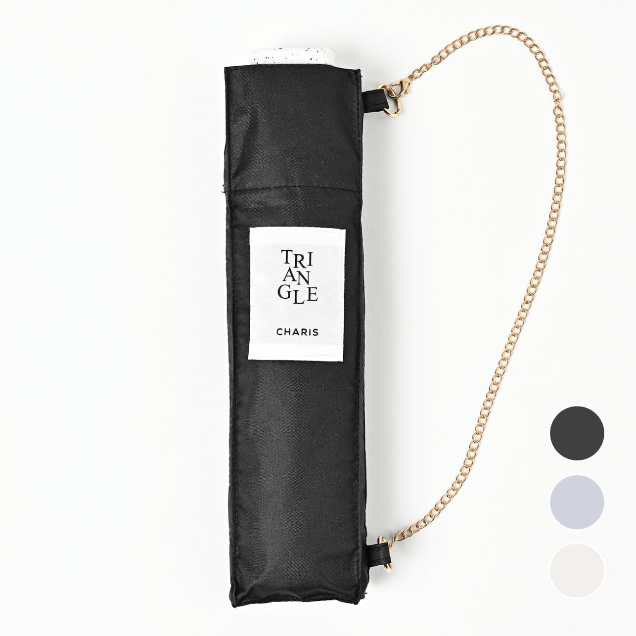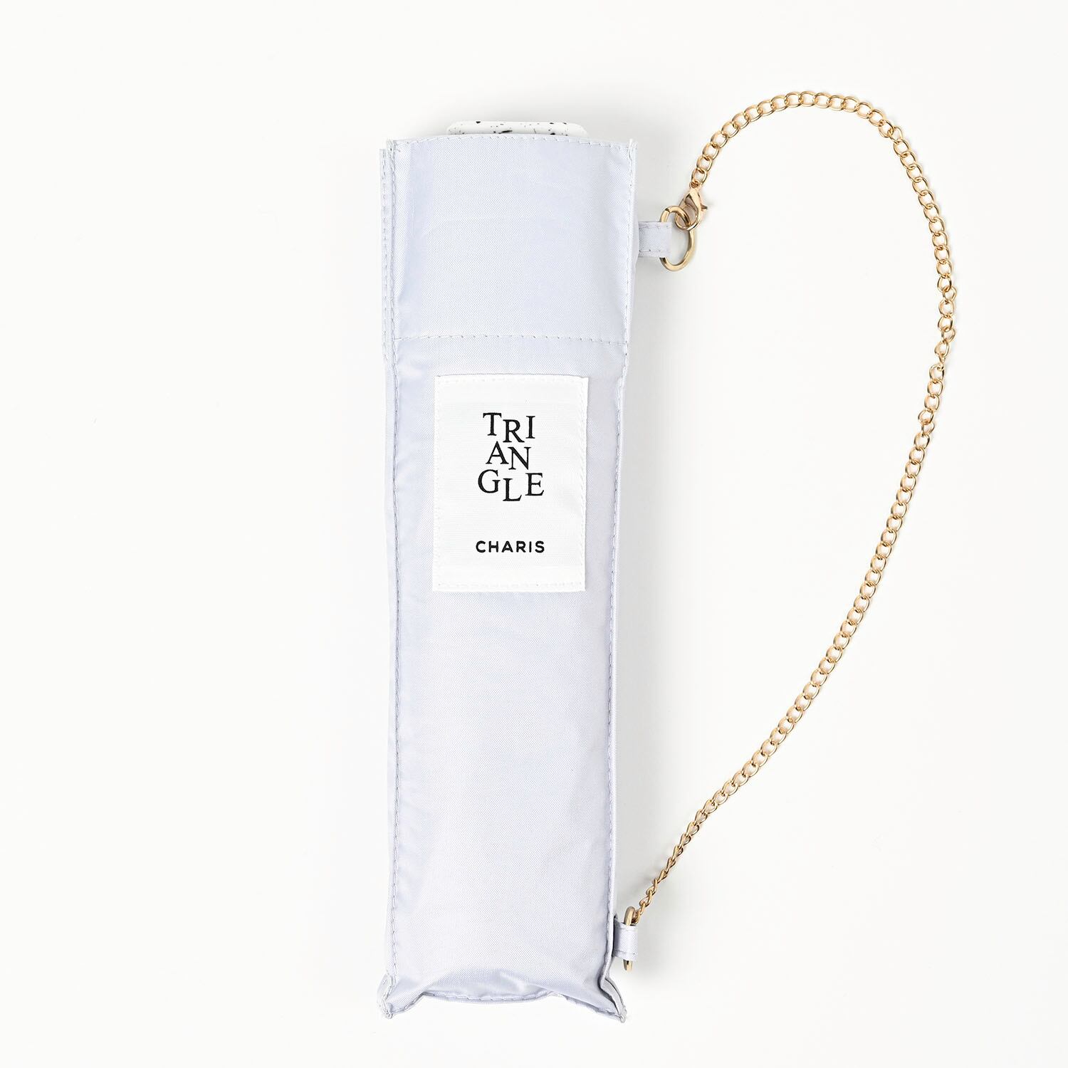 袋にチェーンが付いたアクセサリーみたいなパラソル。 スリムサイズでバッグに取り付け可能。 遮光・UVカット率ともに100%生地使用。 series:TRIANGLE 3color:Black , Blue gray , Ivory Material:polyester 100% Size:50cm Type:square slim mini