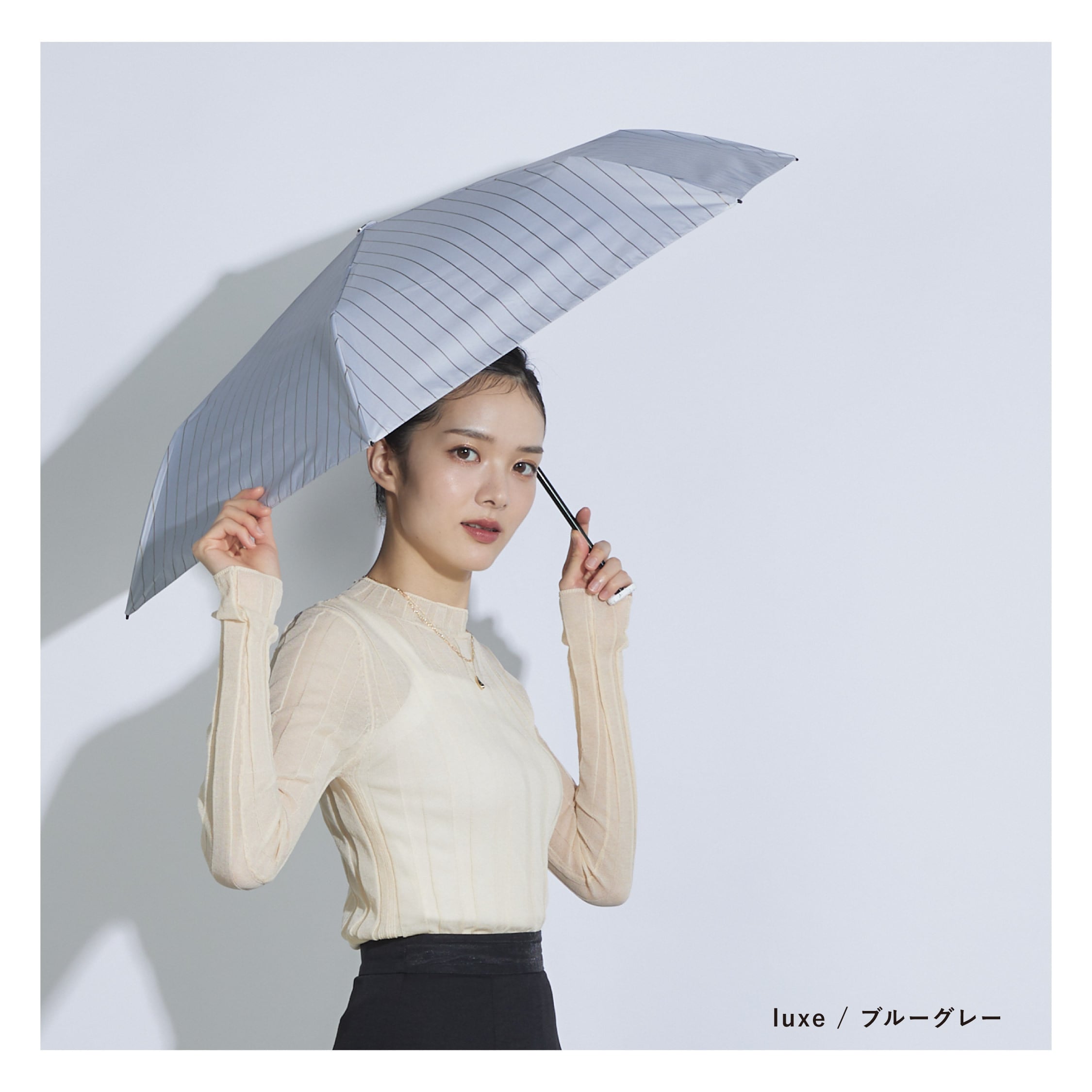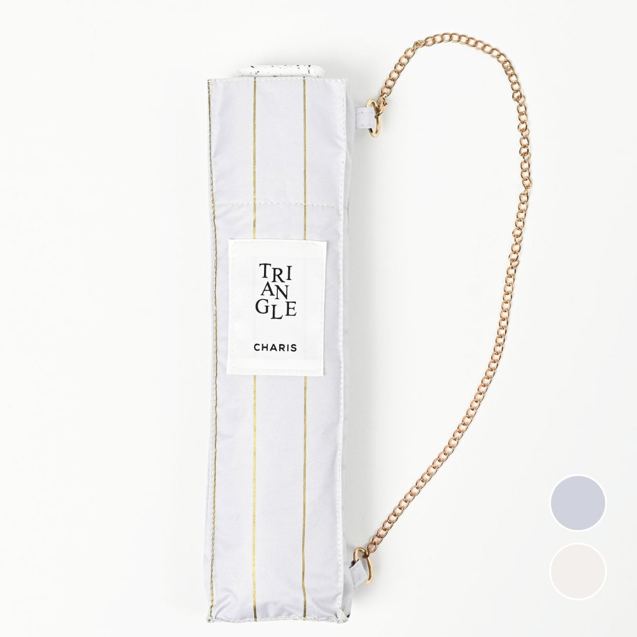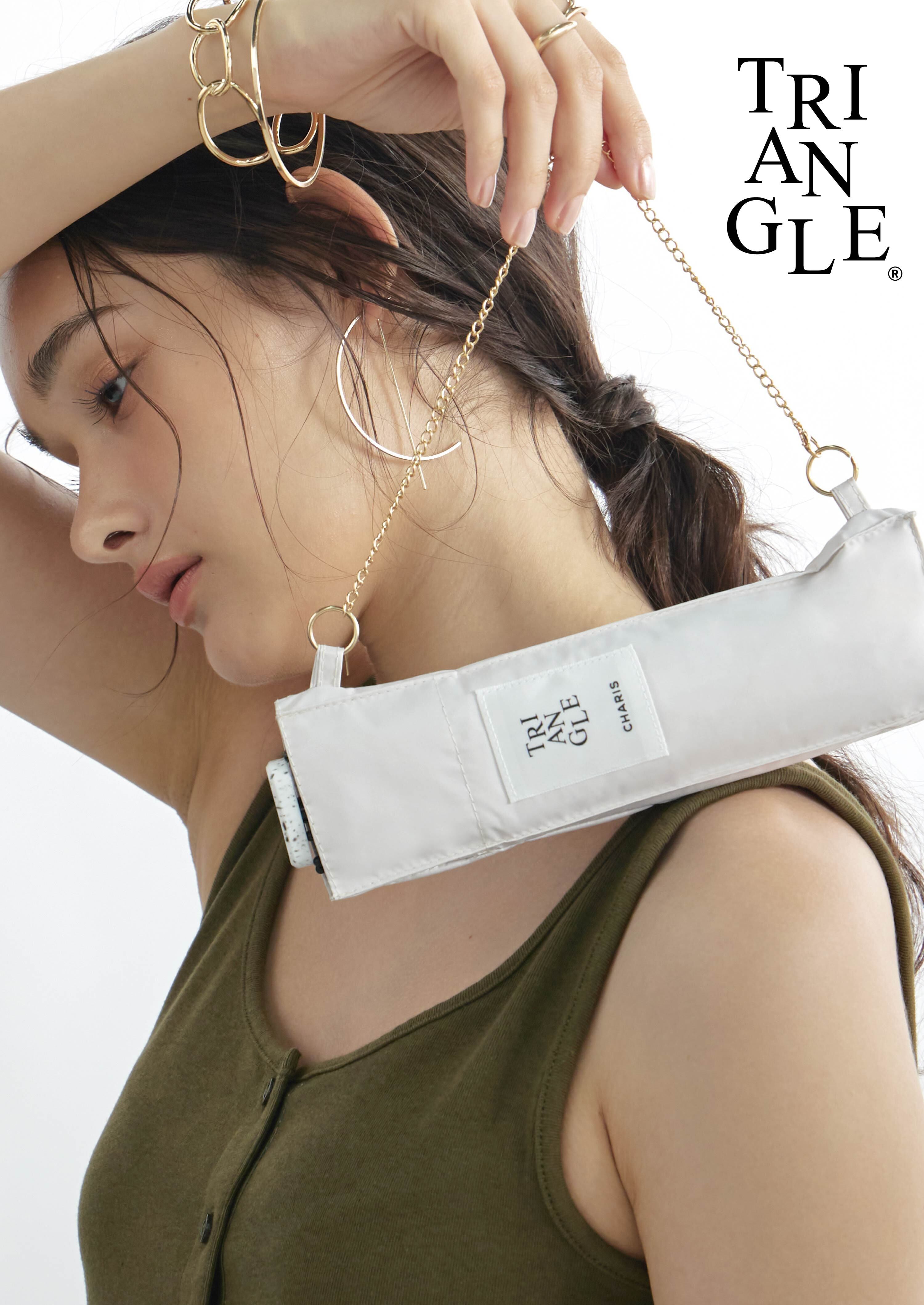 袋にチェーンが付いたアクセサリーみたいなパラソル。 スリムサイズでバッグに取り付け可能。 遮光・UVカット率ともに100%生地使用。 series:TRIANGLE 2color:BlueGray , Ivory Material:polyester 100% Size:50cm Type:square slim mini