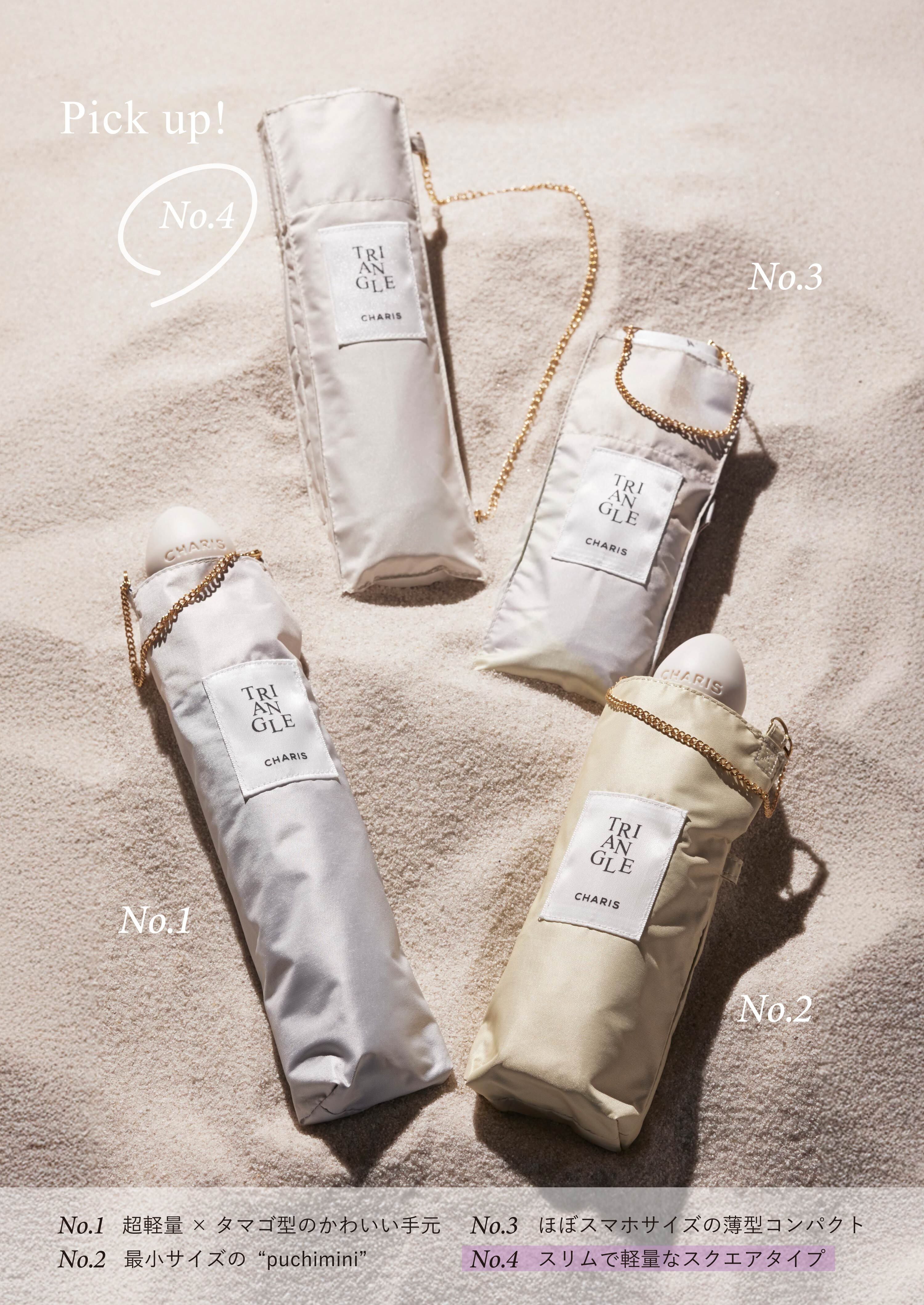 袋にチェーンが付いたアクセサリーみたいなパラソル。 スリムサイズでバッグに取り付け可能。 遮光・UVカット率ともに100%生地使用。 series:TRIANGLE 2color:Beige , Ivory Material:polyester 100% Size:50cm Type:square slim mini