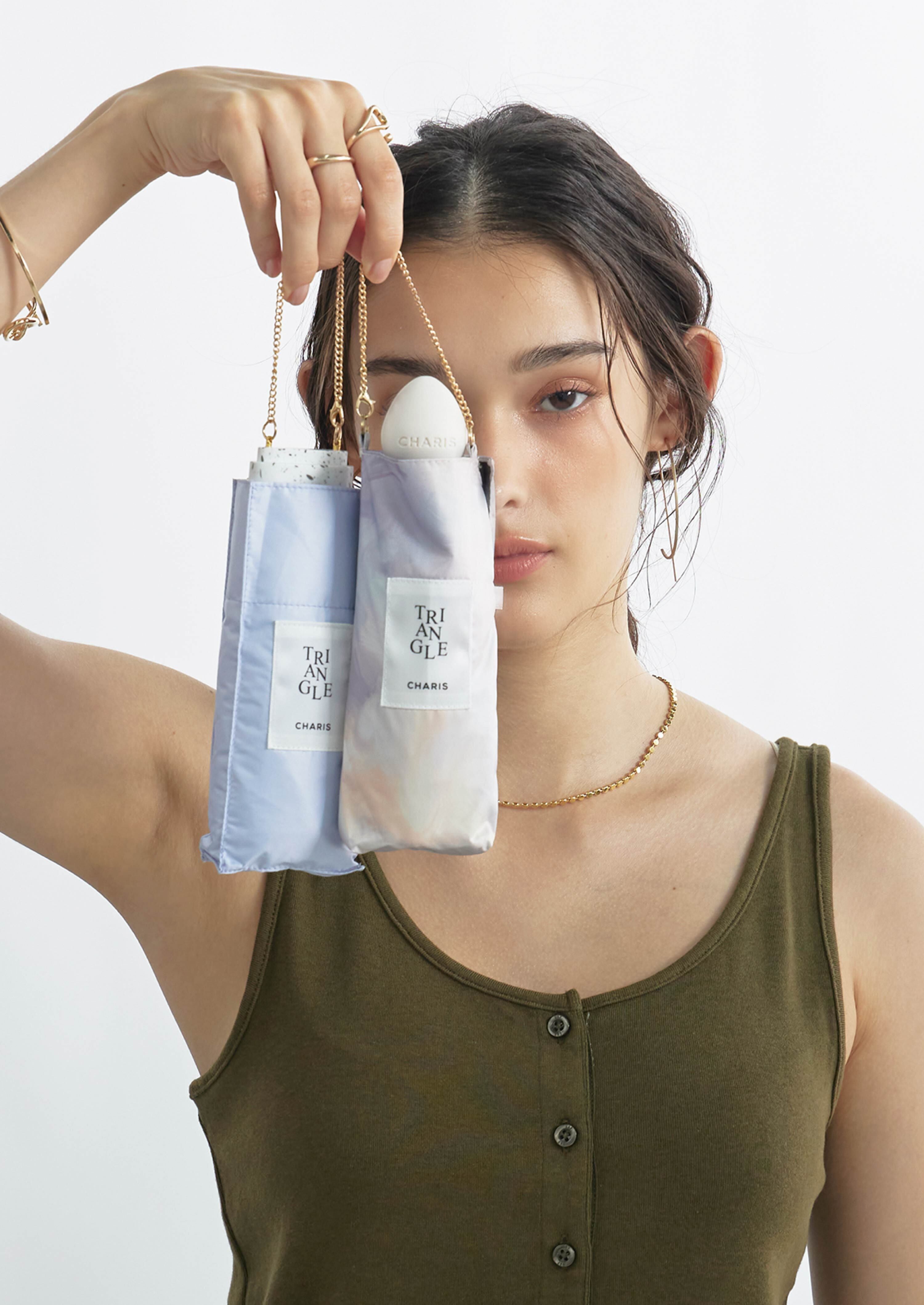 袋にチェーンが付いたアクセサリーみたいなパラソル。 持ち手はにぎりやすいタマゴ型。 超コンパクトサイズでバッグに取り付け可能。 遮光・UVカット率ともに100%生地使用。 series:TRIANGLE 2color:Beige , Pink Material:polyester 100% Size:50cm Type:puchimini