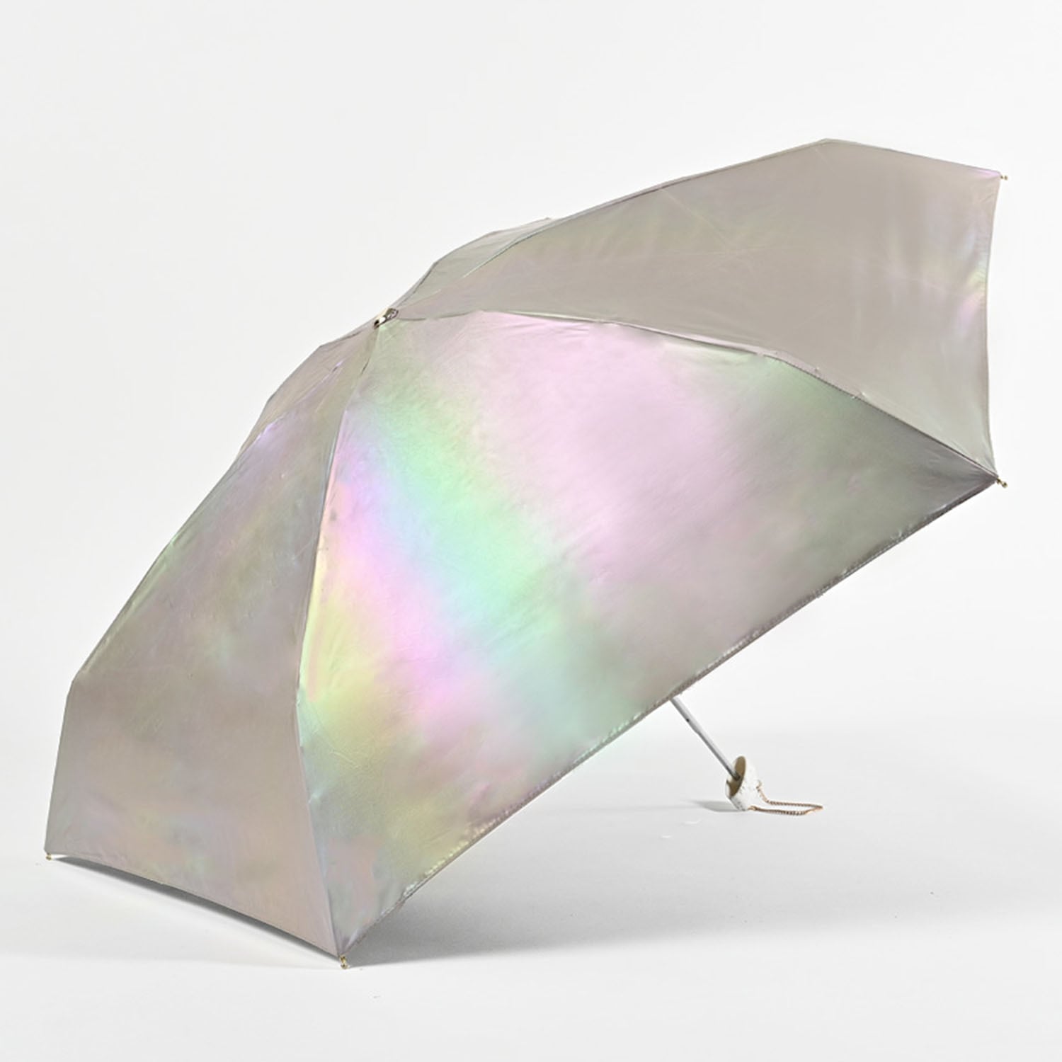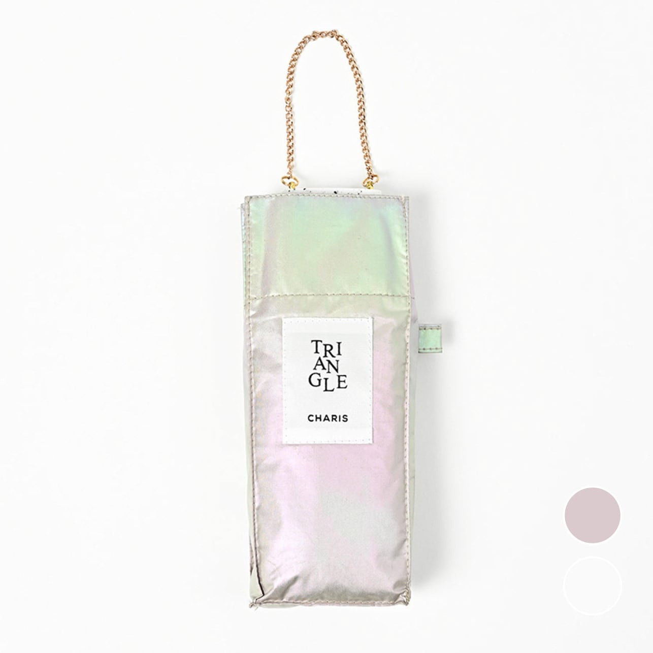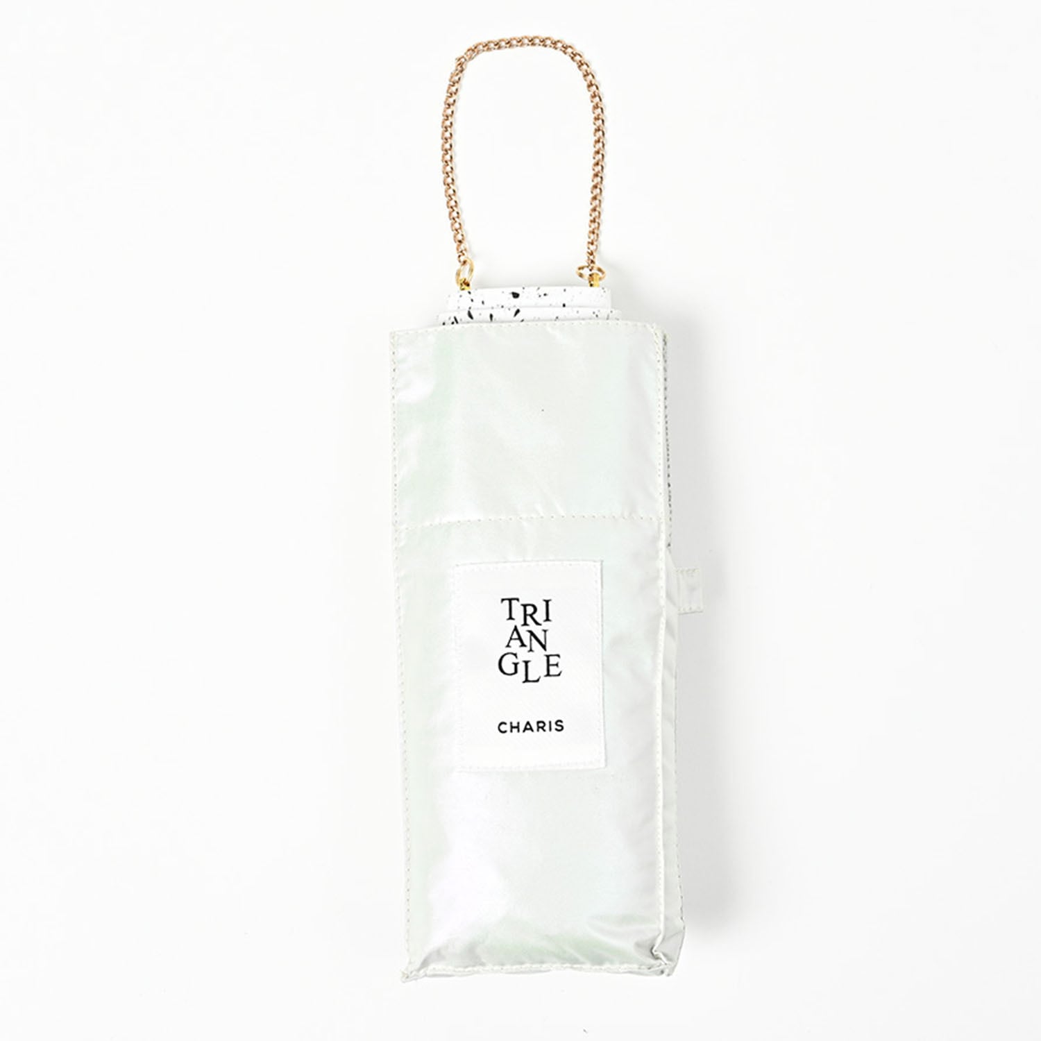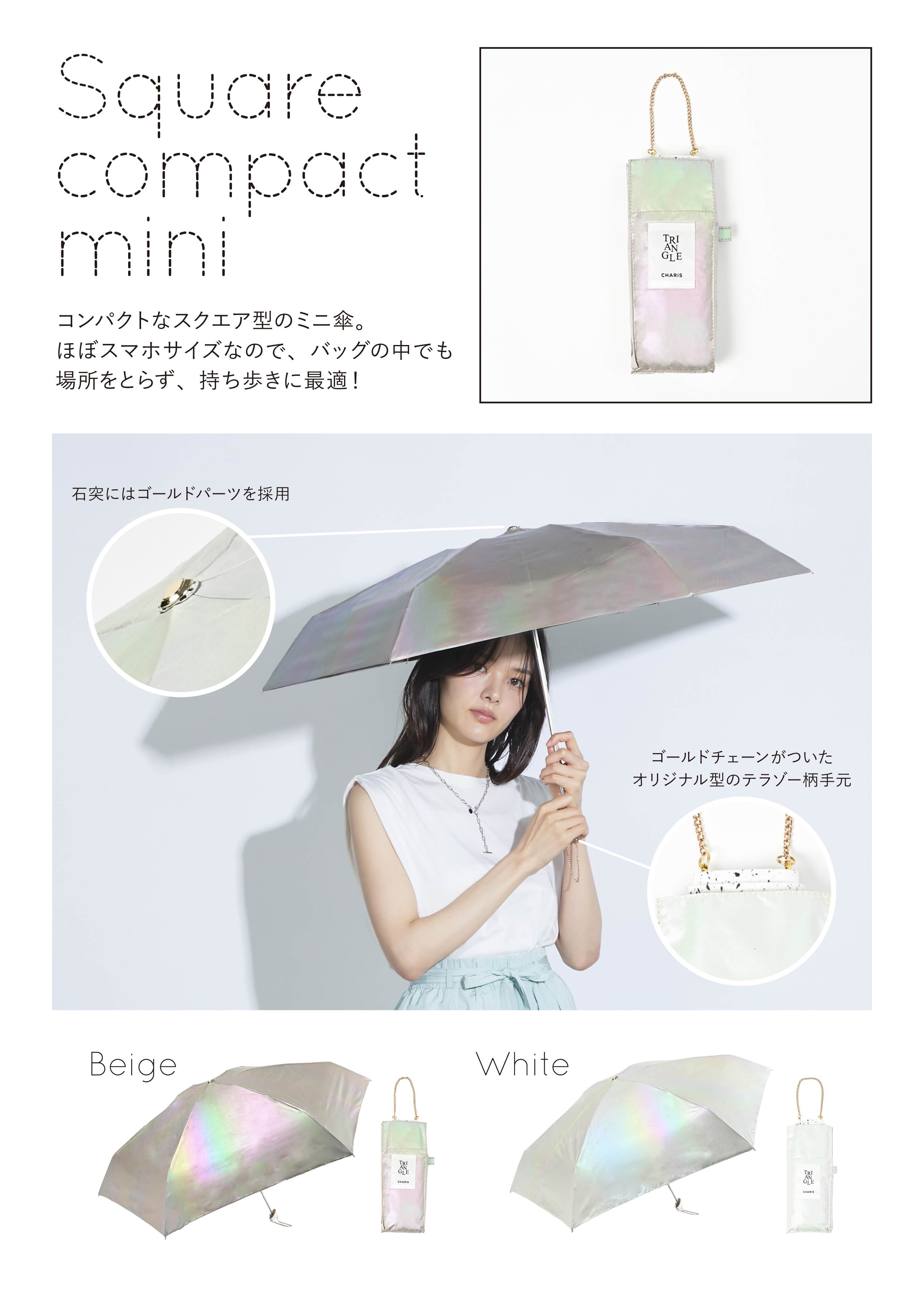 持ち手にチェーンが付いたアクセサリーみたいなパラソル。 化粧品のハイライターのような輝きを放つ特殊生地を採用。 超コンパクトサイズでバッグに取り付け可能。 遮光・UVカット率ともに100%生地使用。 Series:TRIANGLE 2color:Beige , White Material:nylon 100% Size:50cm Type:square compact mini