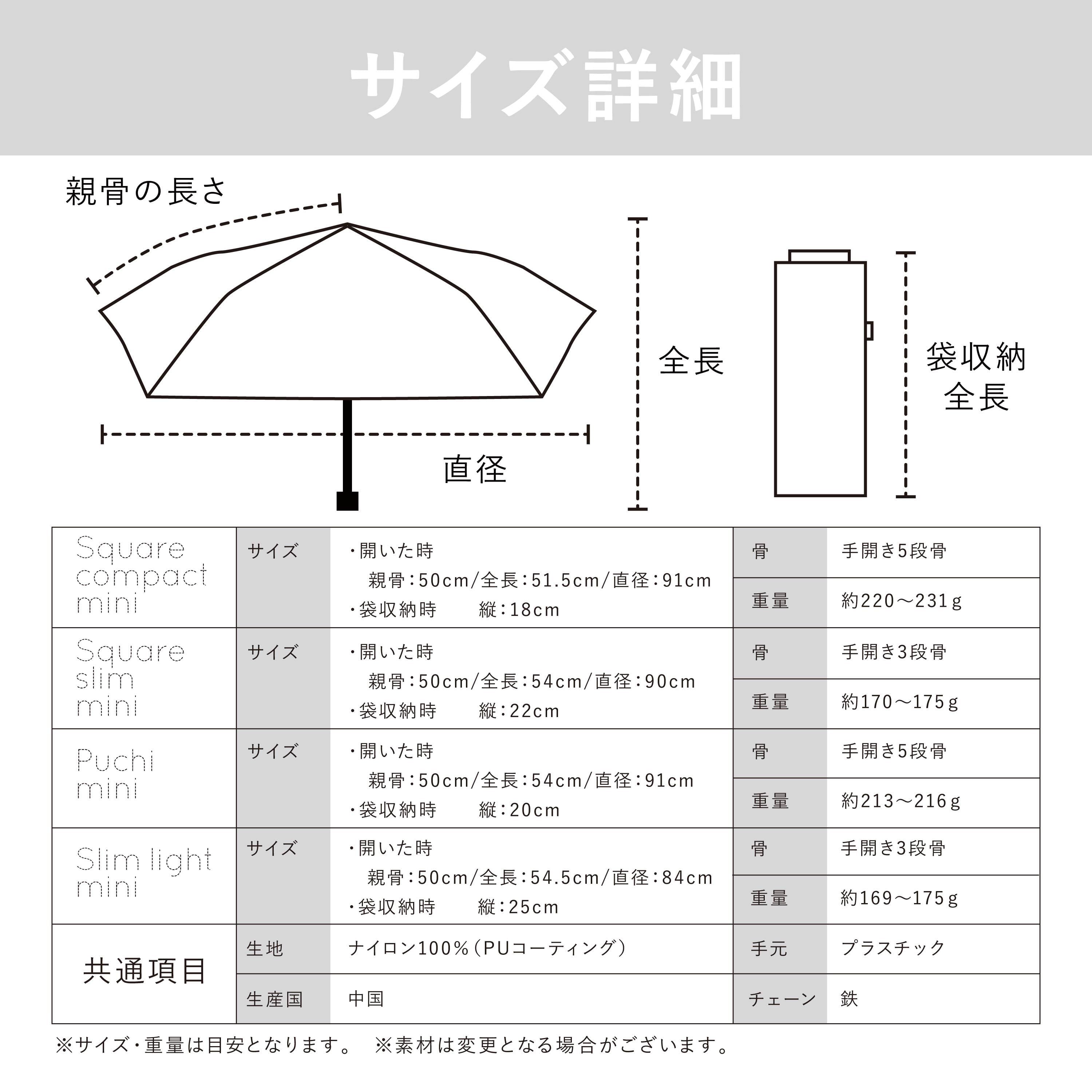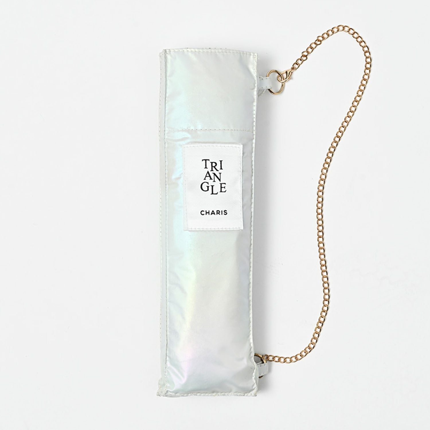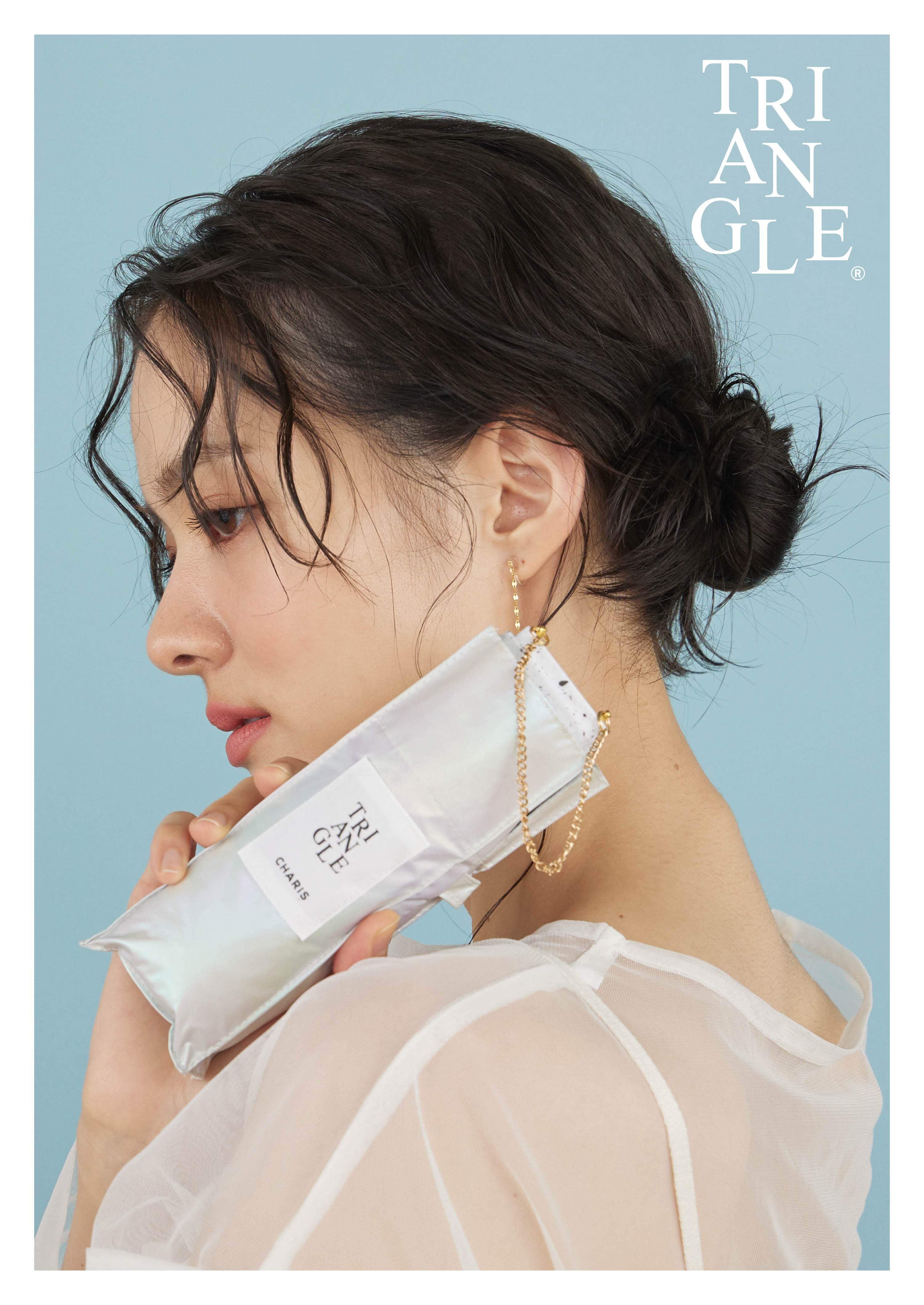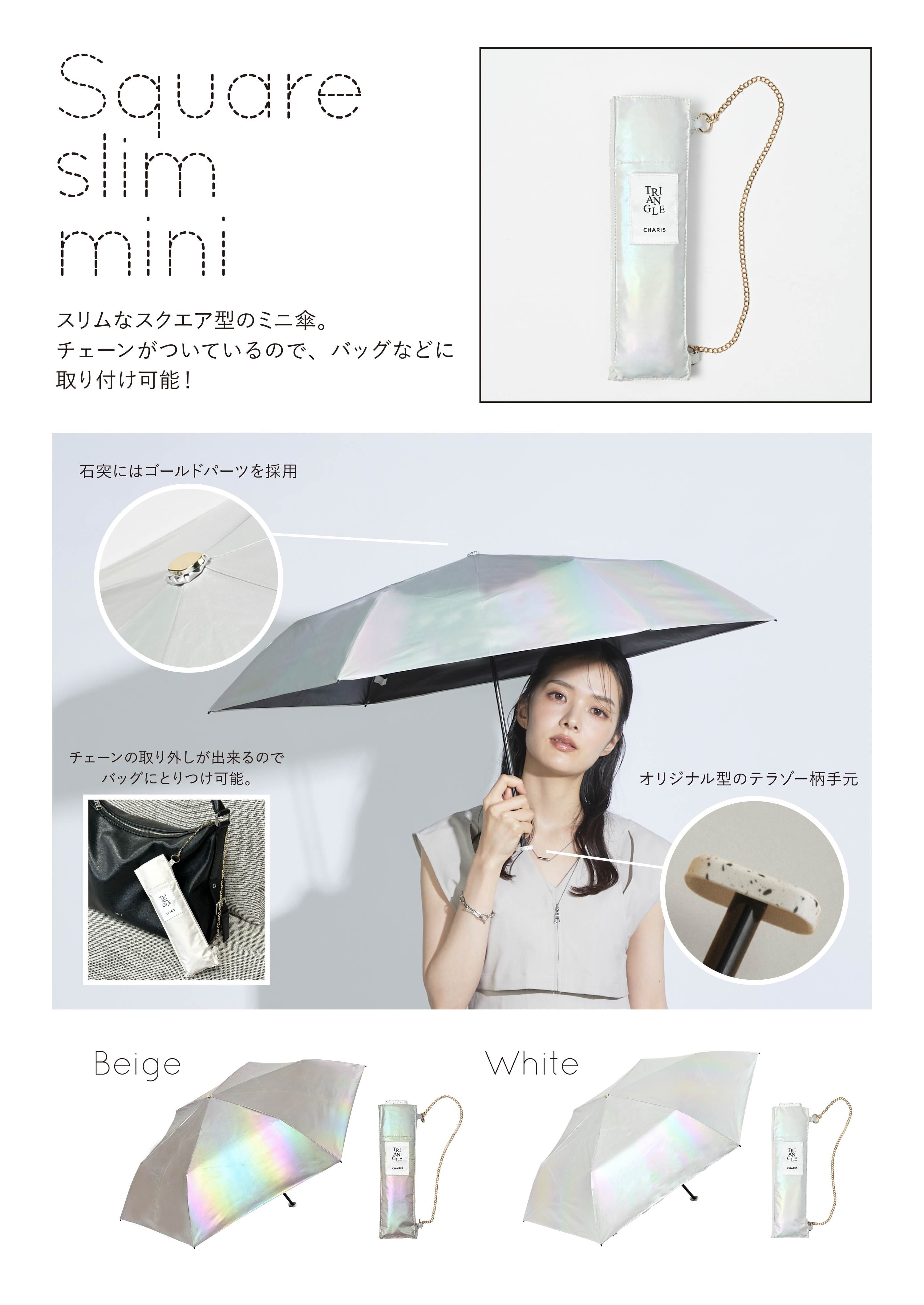 袋にチェーンが付いたアクセサリーみたいなパラソル。 化粧品のハイライターのような輝きを放つ特殊生地を採用。 スリムサイズでバッグに取り付け可能。 遮光・UVカット率ともに100%生地使用。 Series:TRIANGLE 2color:Beige , White Material:nylon 100% Size:50cm Type:square slim mini